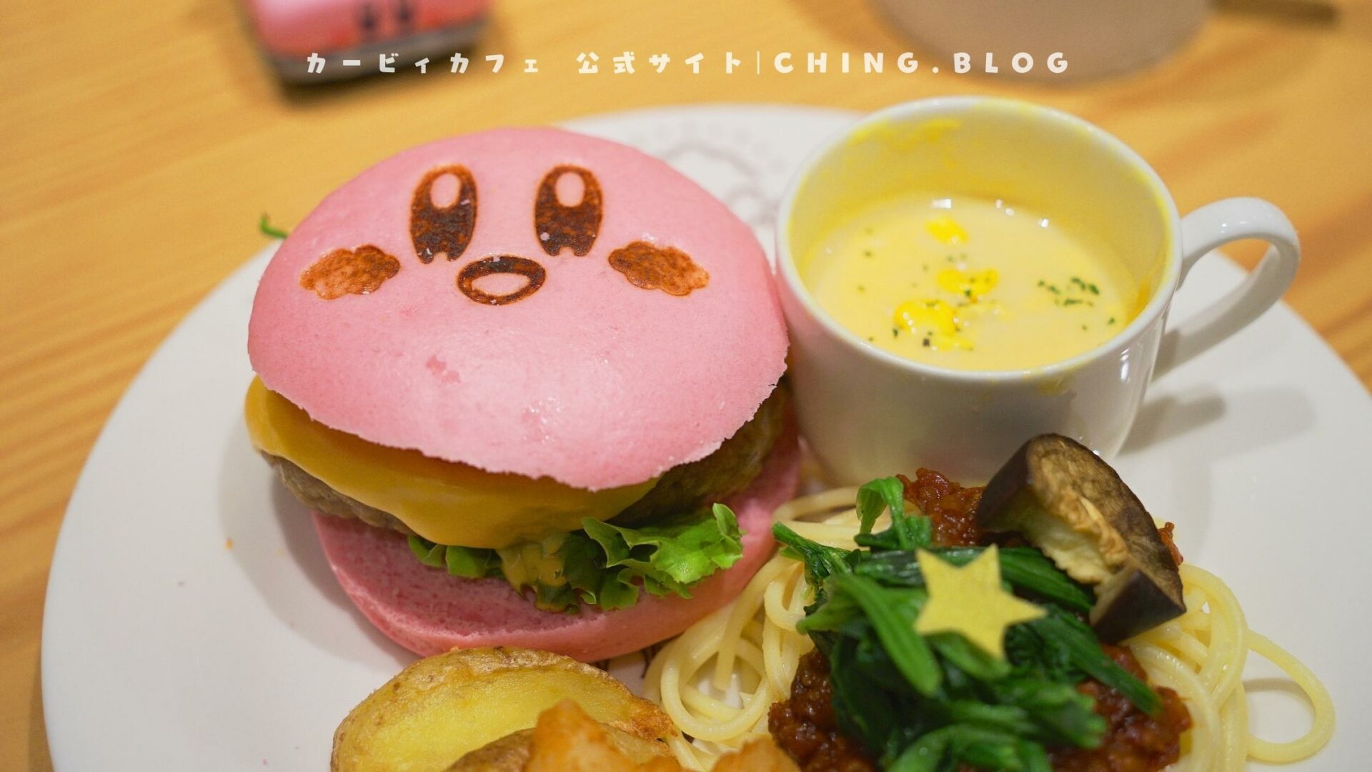 I chose the Kirby Burger, a simple burger with a patty, cheese, and lettuce. It’s quite standard, but the bun is pink with Kirby’s face printed on it, making it irresistibly cute!