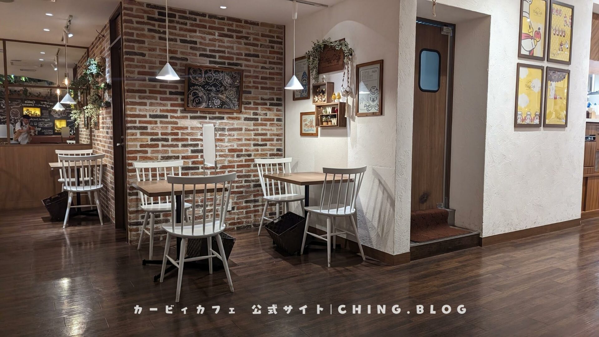 The café interior features dark wood flooring and brick wall style, with framed pictures and plant decorations on the walls, creating a very cozy and cute atmosphere.