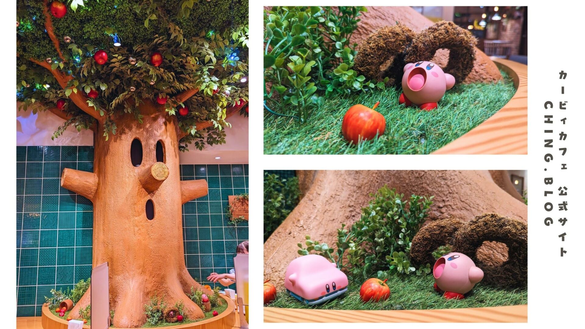 The artificial grass under the tree recreates the game scene, with giant apples and a Kirby figure ready to inhale, perfect for bringing your own toys for a photo shoot!