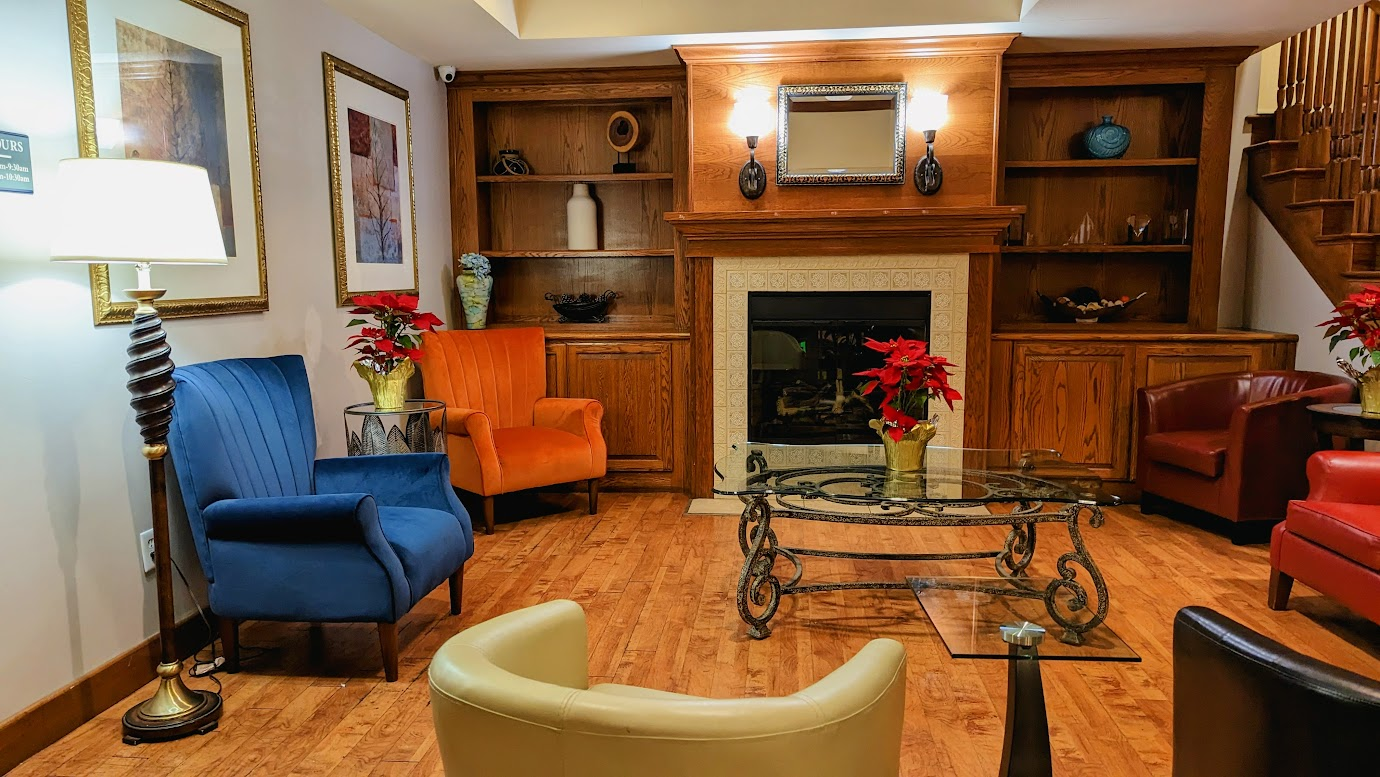 大廳設有舒適的沙發區和壁爐設計,空氣中瀰漫著一種放鬆的氣息,讓旅途最後一晚的焦慮感降低了不少。