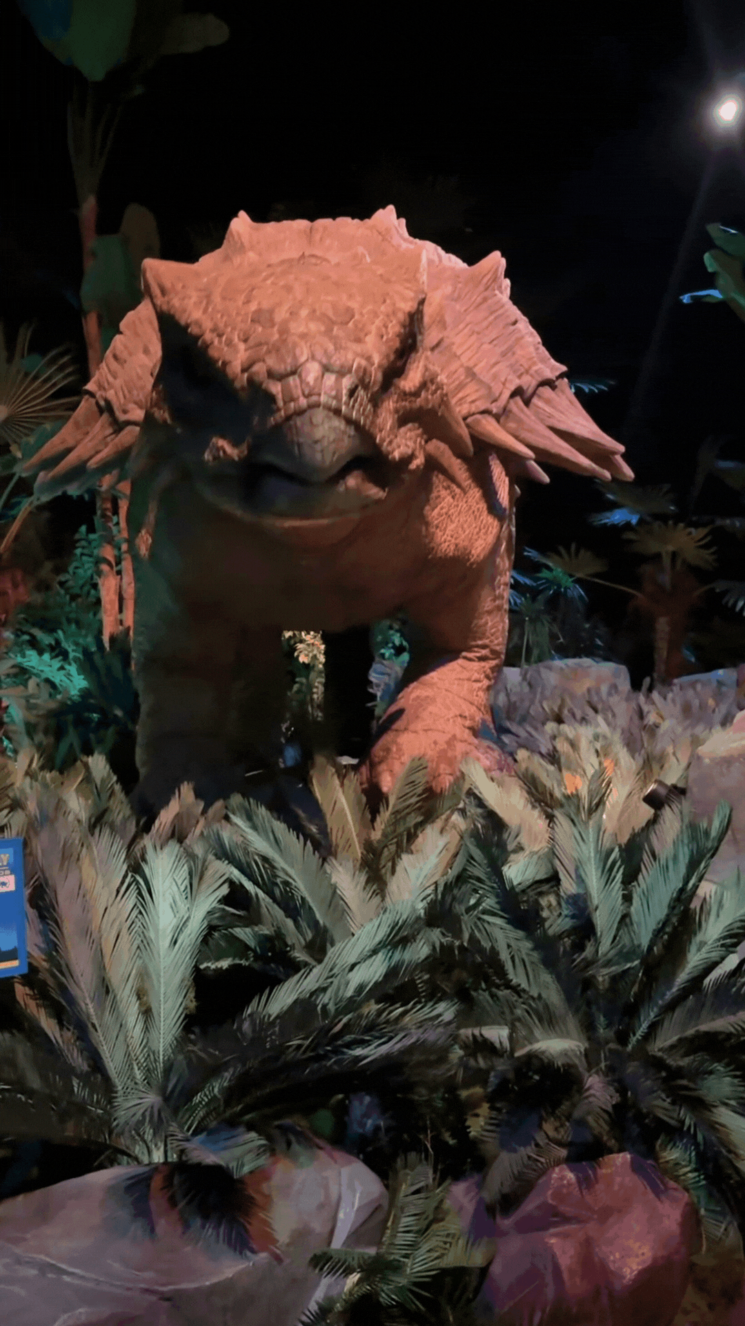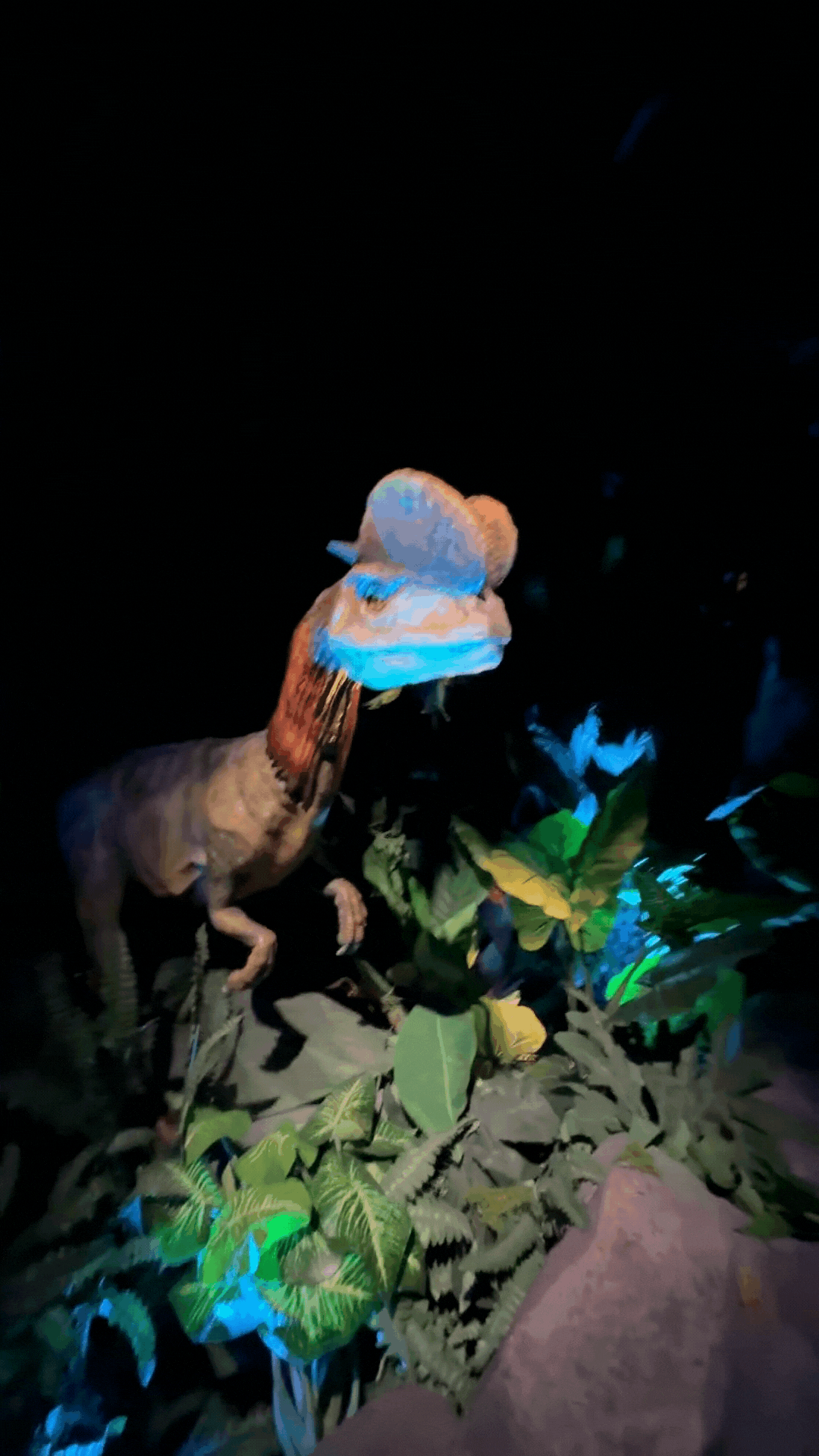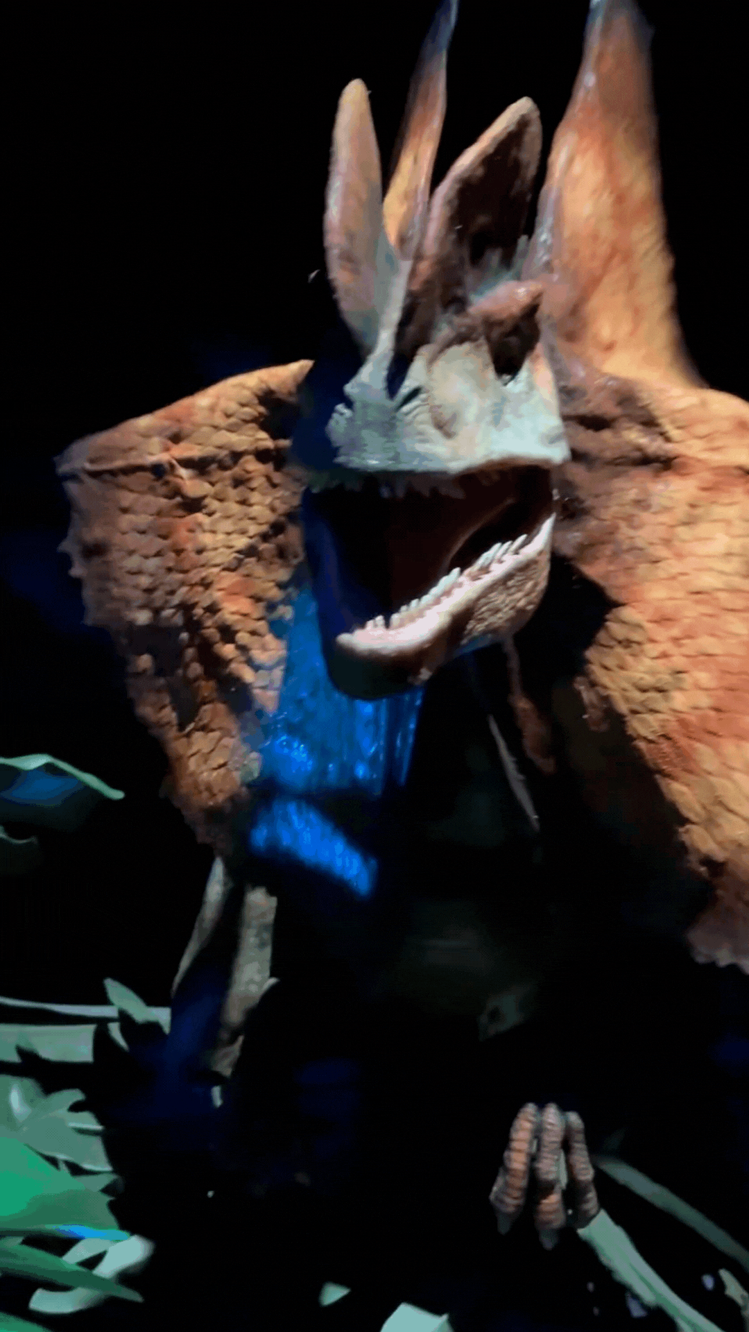 展區內還有好幾隻巨大的擬真恐龍,它們不僅會動、會吼叫、會眨眼,如果你靠近觀察,甚至能看到牠們的鼻孔會隨著呼吸擴張。